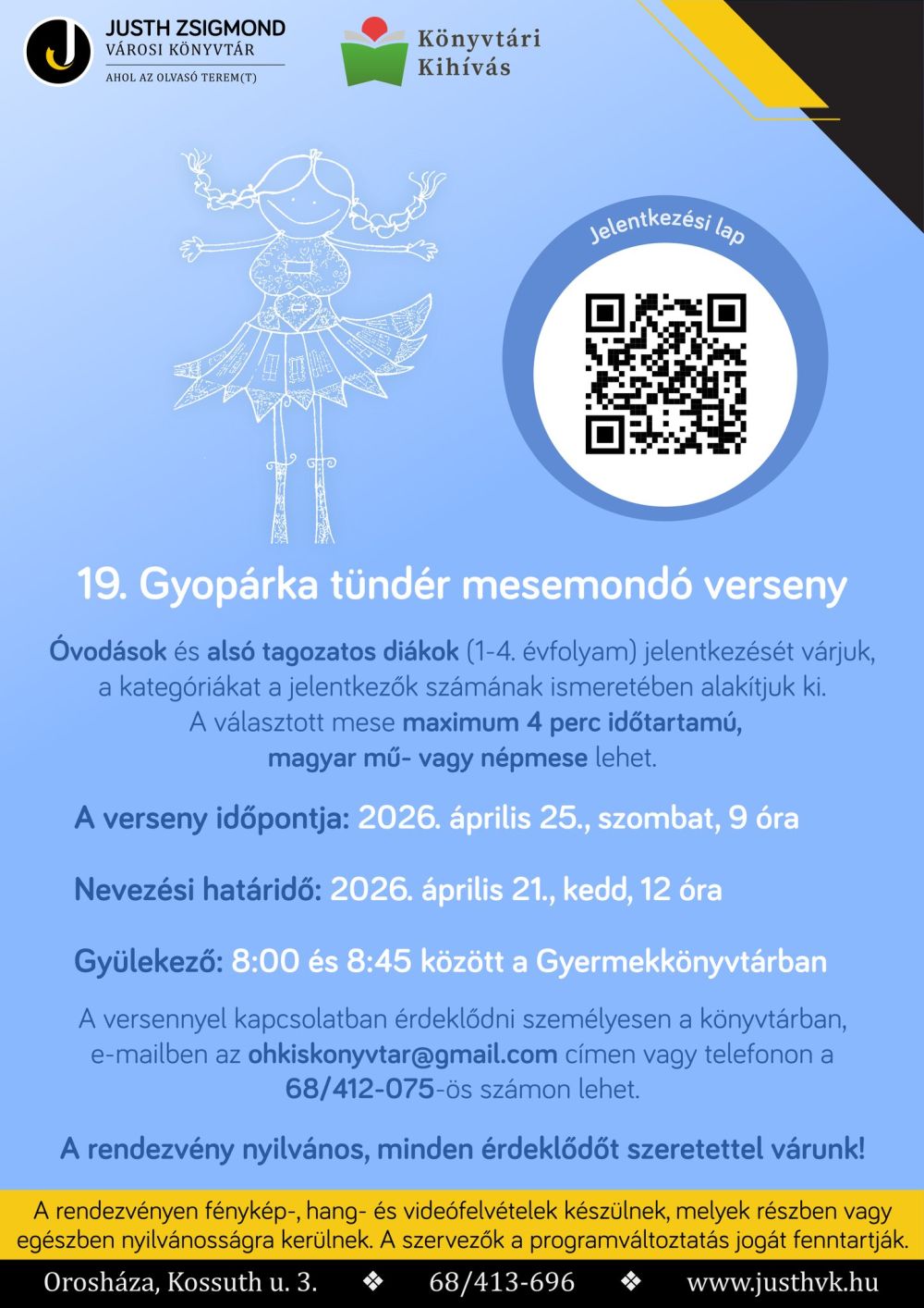 👫 Óvodások és alsó tagozatos diákok (1-4. évfolyam) jelentkezését várjuk, a kategóriákat a jelentkezők számának ismeretében alakítjuk ki. A választott mese maximum 4 perc időtartamú, magyar mű- vagy népmese lehet.