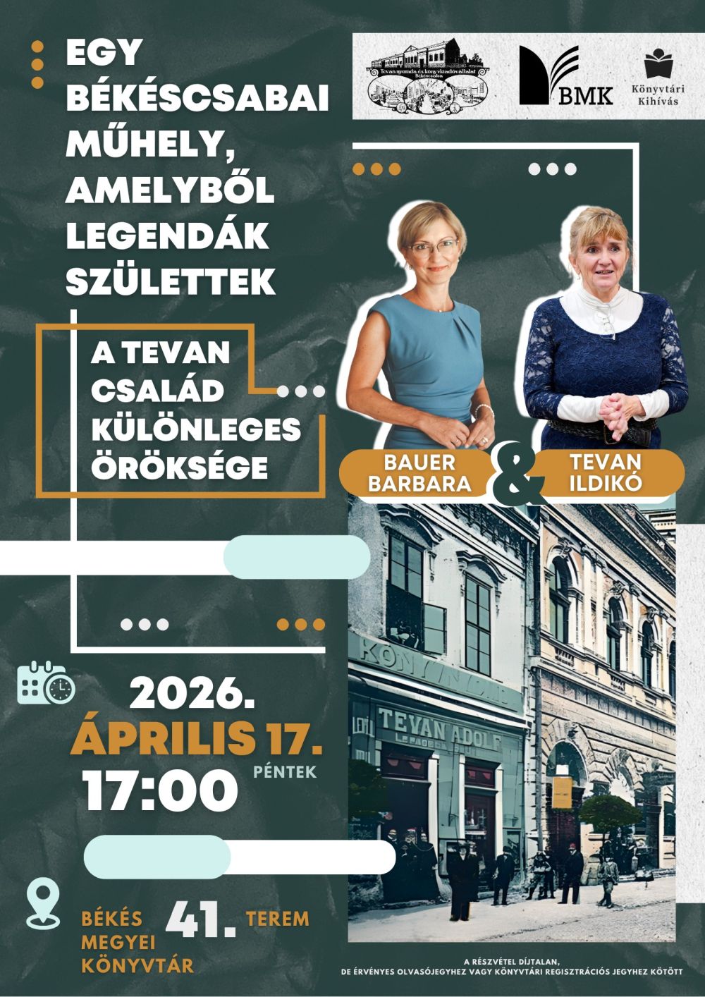2026. április 17-én, pénteken 17 órás kezdéssel Bauer Barbara beszélgetőtársa Tevan Ildikó, a Tevan Alapítvány elnöke, a nyomdaalapító Tevan Adolf dédunokája. Szeretnénk Önökkel megismertetni a Tevan család és nyomda történetét!