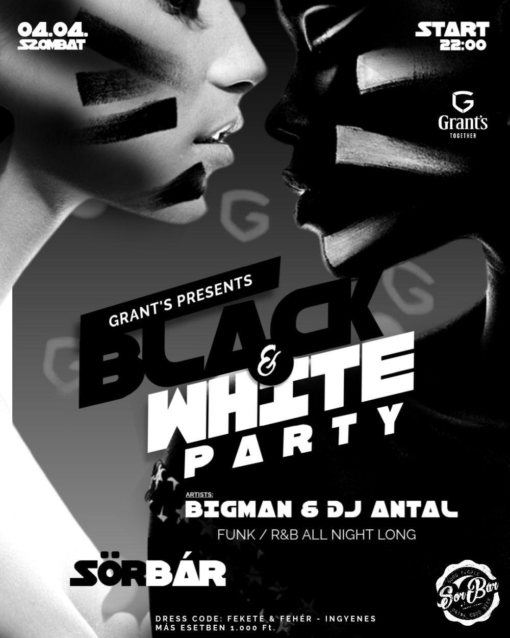 BLACK & WHITE pres. by Grant’s Whisky 🖤🤍 04.04. SZOMBAT Egy este, ahol a kontraszt találkozik a hangulattal. Funky & R&B egész éjszaka! Igazi fekete zenei csemegék, groove-ok és klasszik