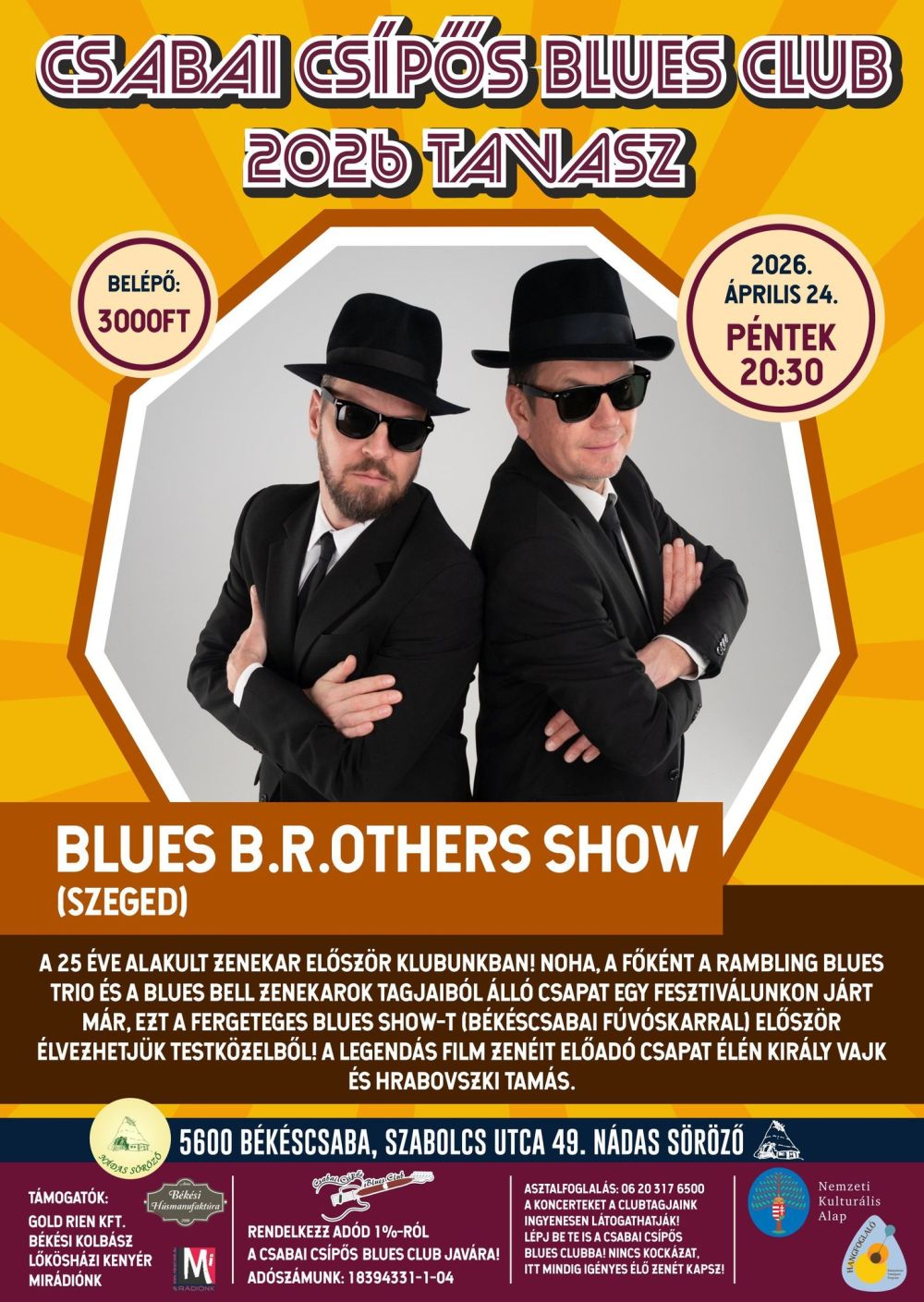 A legendás, 25 éve alakult zenekar lehengerlő blues show-t vezet elő, a kultikus Blues Brothers c. film zenéjének megidézésével. A szegedi csapat élén Király Vajk és Hrabovszki Tamás valamint Tabatabai