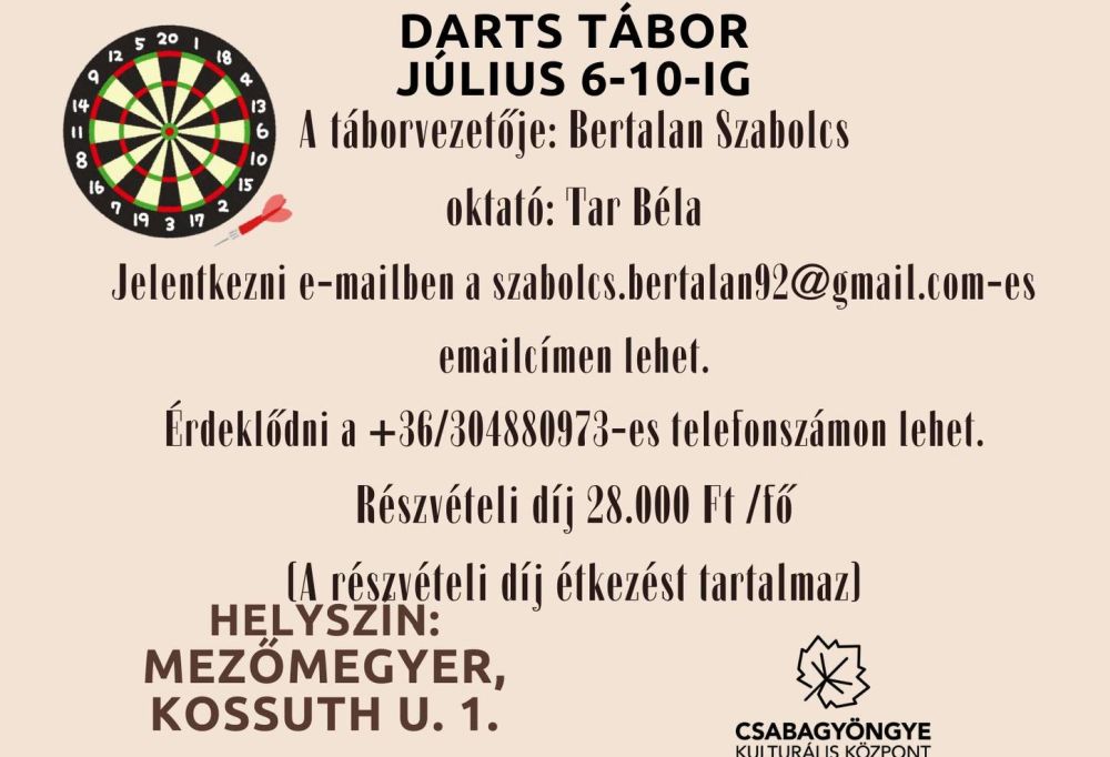 2026hétfő06júliusEgész napDarts tábor Mezőmegyeren(Egész nap: hétfő) TelepülésMezőmegyerArany János Művelődési HázKategóriaSport,Tábor