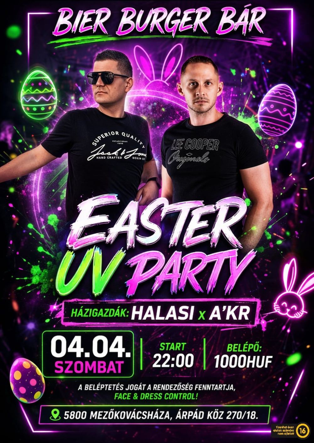 2026szombat04április22:00Easter UV Party a Bier Burger Bárban22:00 TelepülésHétvége,MezőkovácsházaBier-Burger-BárKategóriaBuli,Húsvét