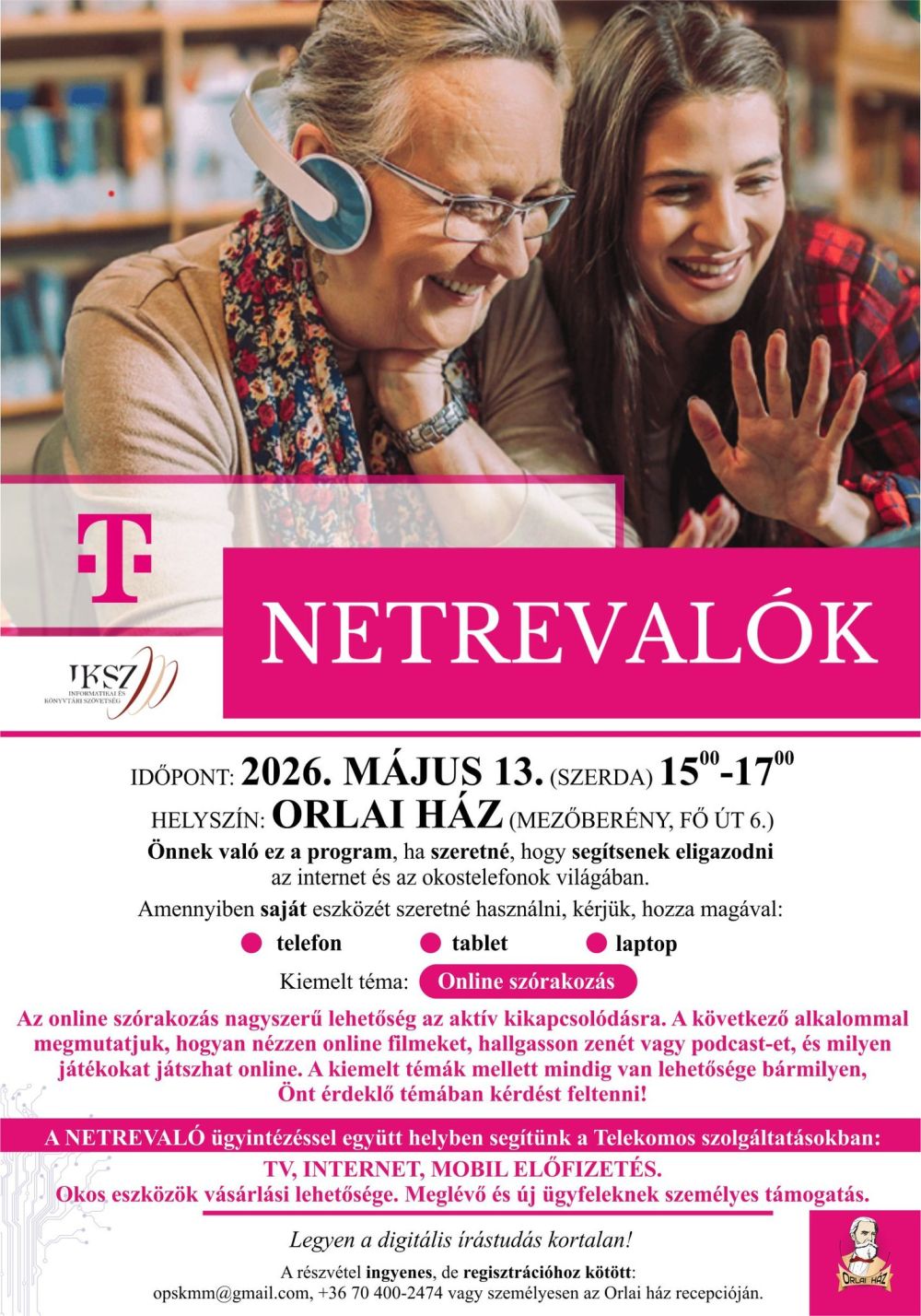 Önnek való ez a program, ha szeretné, hogy segítsenek eligazodni az internet és az okos telefonok világában. Hogyan lehet jelen a közösségi felületeken és tarthat kapcsolatot a barátaival és a családtagjaival? Amennyiben saját eszközét szeretné használni, kérjük, hozza magával: telefon, tablet, laptop.
