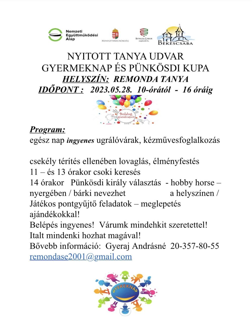 2026csütörtök28május10:0016:00Nyitott tanya udvar10:00 - 16:00 TelepülésBékéscsabaRemonda Szabadidős, Lovas- és SportegyesületKategóriaGyerekeknek,Gyermeknap