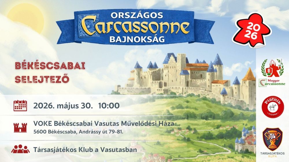 🏰 HÓDÍTSD MEG CARCASSONNE VÁROSÁT — ÉS JUSS EL A VILÁGBAJNOKSÁGIG! Megnyílt a regisztráció az Országos Carcassonne Bajnokság békéscsabai selejtezőjére. Ha szereted a Carcassonne-t, itt a lehetőség, hogy versenyen is kipróbáld magad