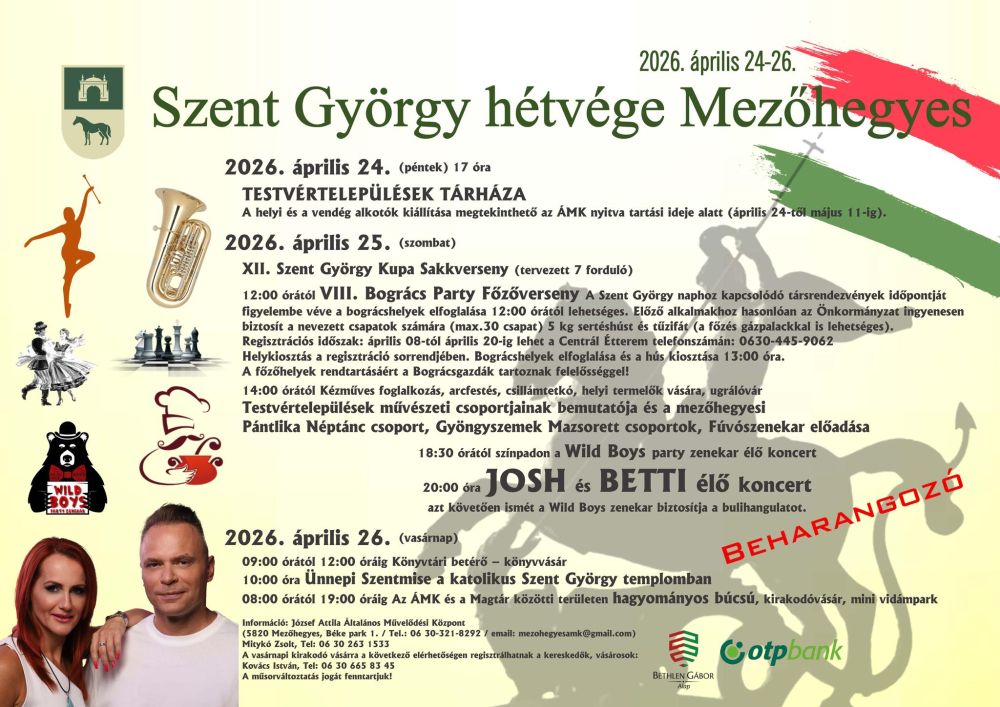 2026péntek24áprilisEgész napvasárnap26Szent György hétvége Mezőhegyesen(Egész nap) TelepülésHétvége,MezőhegyesJózsef Attila ÁMKKategóriaKözösség