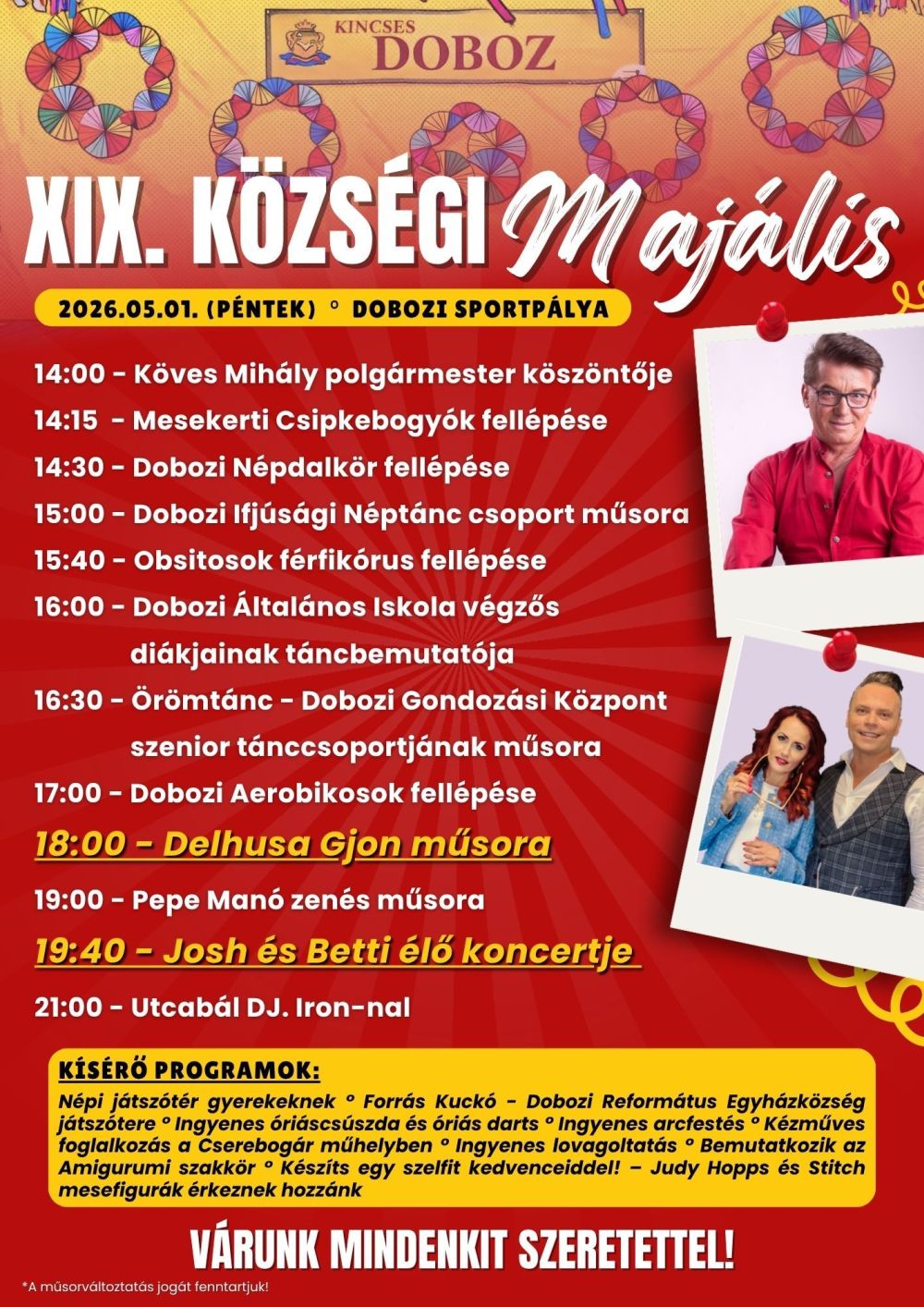 2026péntek01május14:00XIX. Községi Majális Dobozon14:00 TelepülésDoboz,HétvégeSportpálya - DobozKategóriaMajális