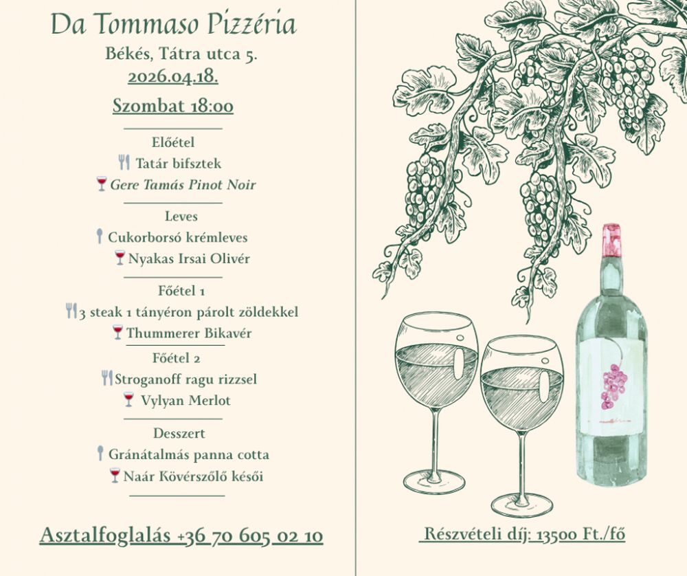 A békési borkedvelők számára különleges gasztronómiai élményt kínál a Da Tommaso, ahol egy exkluzív borvacsora keretében öt fogás és öt gondosan kiválasztott bor találkozik egy estén. Április 18-án 18:00 órától a
