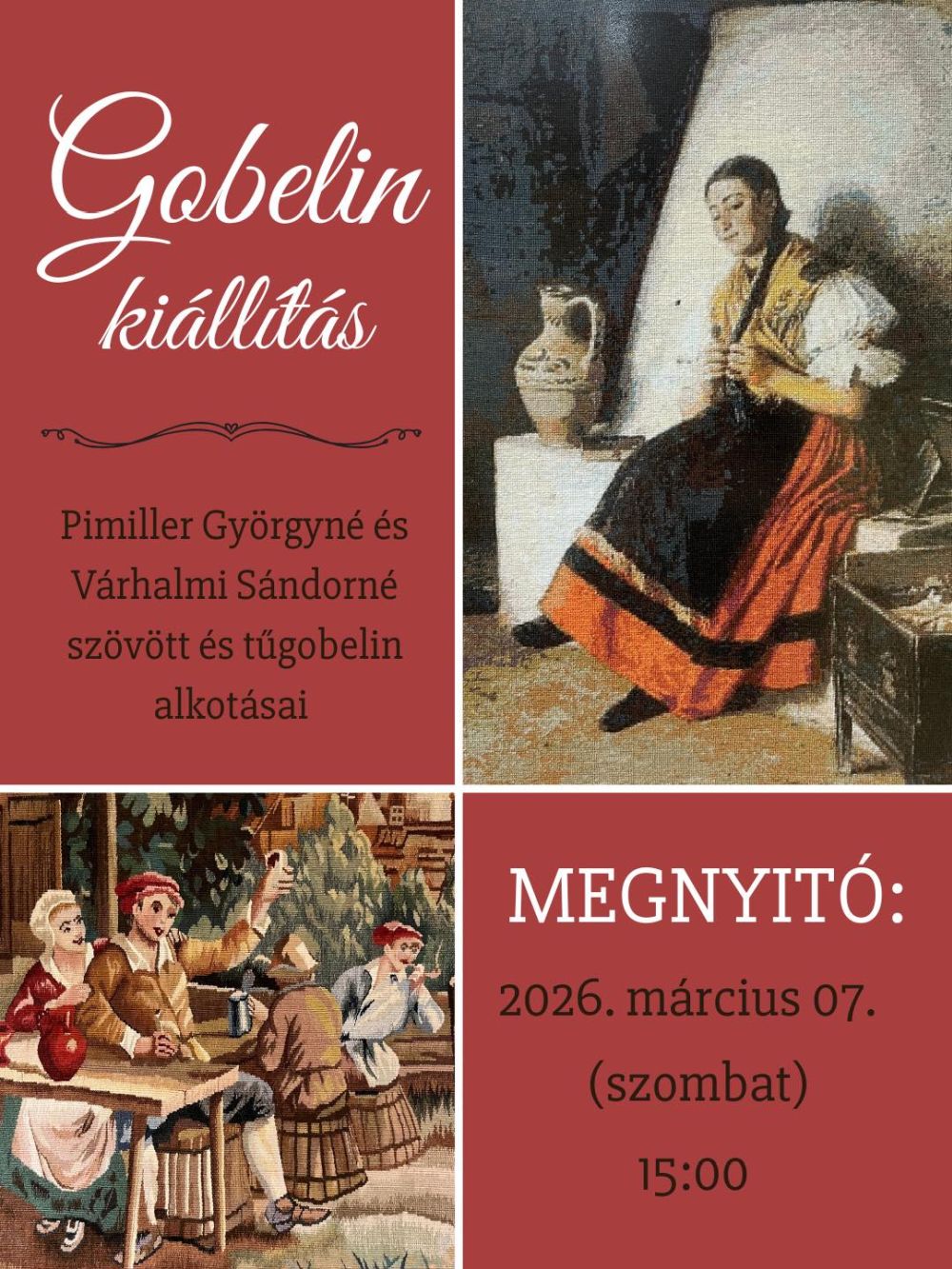 Szeretettel várunk minden érdeklődőt új tárlatunkra, ahol Pimiller Györgyné és Várhalmi Sándorné szövött és tűgobelin alkotásai kerülnek bemutatásra.