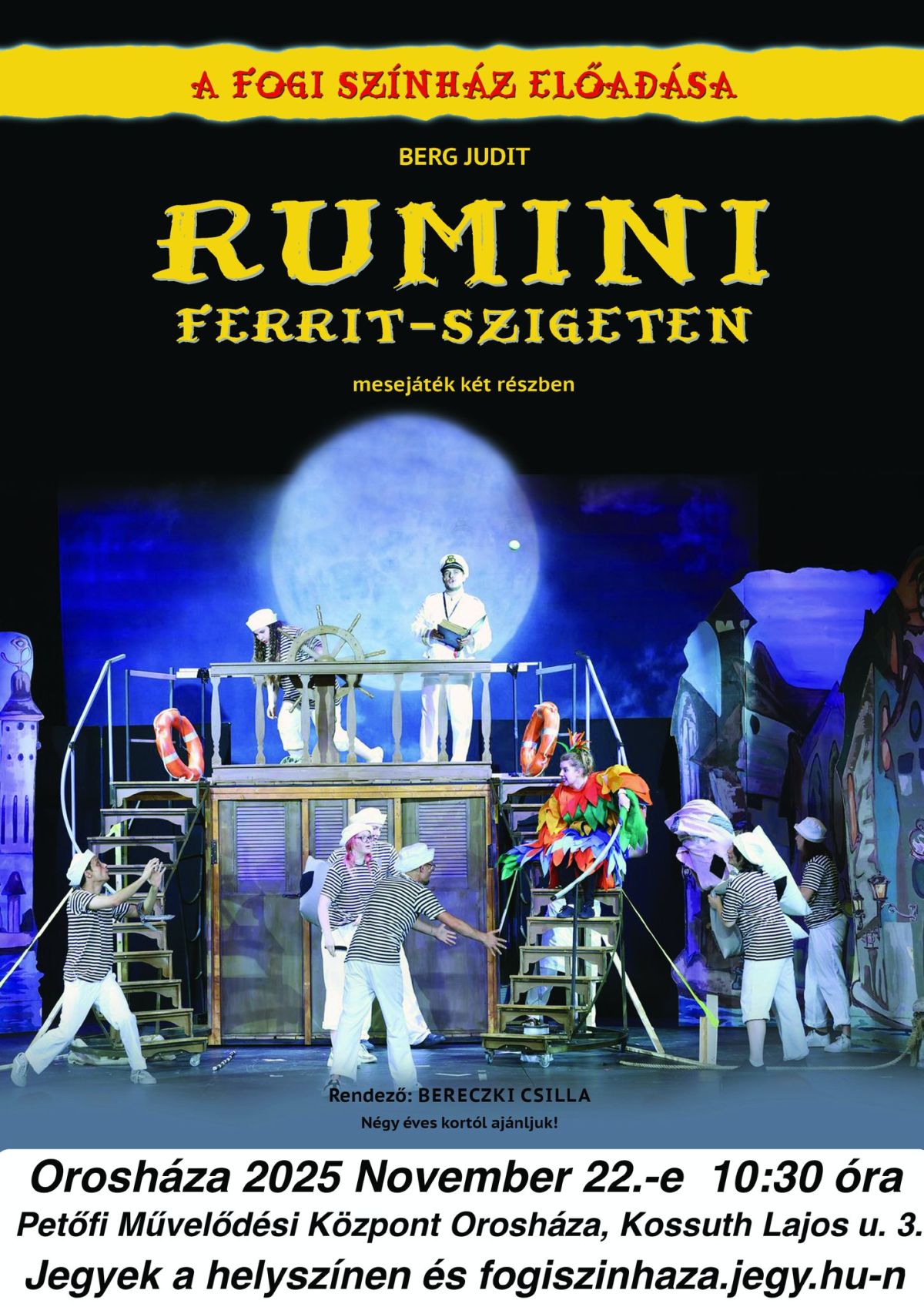 Írta: Berg Judit. A Pesti Művész Színház- Fogi Színház előadása RUMINI Ferrit-szigeten – mesejáték Négy éves kortól ajánljuk! Díszlettervező: Halász G. Péter Zene: Harmath Imre Dalszöveg: Lénárt