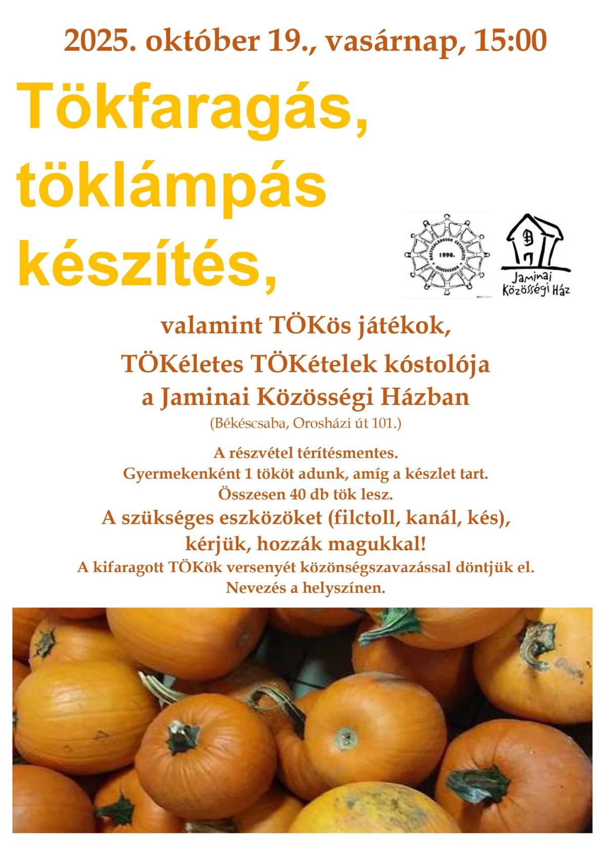 Ezen a héten vasárnapra hívjuk a családokat, a hagyományos TÖKös rendezvényünkre. Lesz benne TÖKfaragás –> TÖKLÁMPÁS készítés, közönségszavazás a legeredetibb TÖKlámpásokról, TÖKös fánk és sütőTÖKlé kóstolás. A részvétel tértésmentes. Jutalom: a kifaragott TÖK maga.