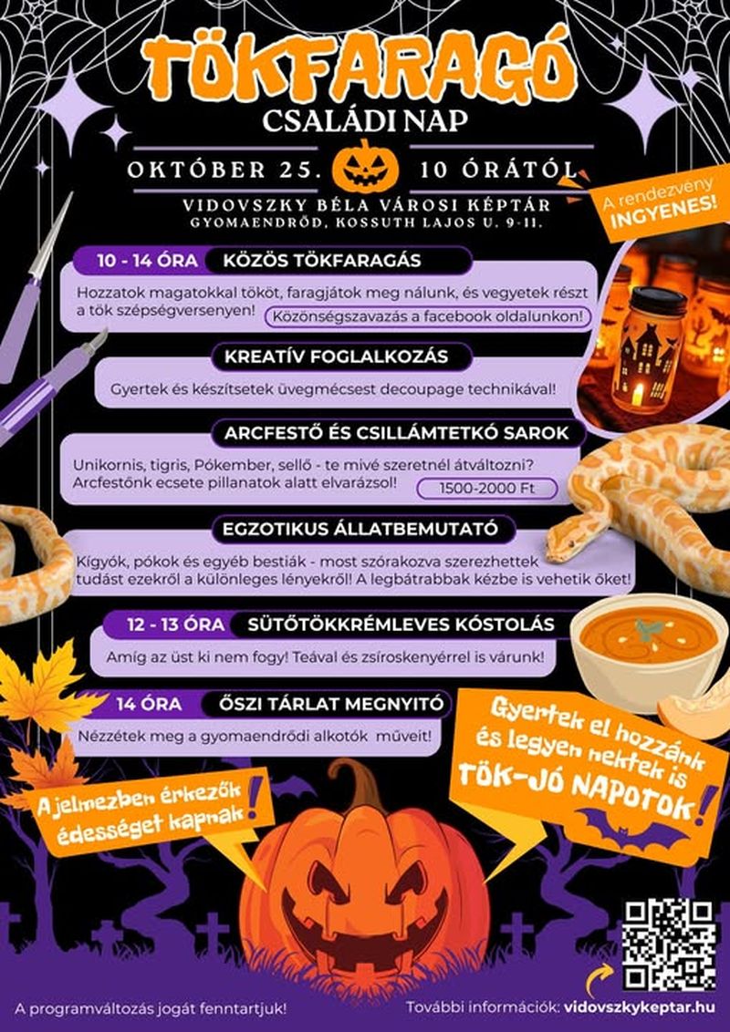 A Vidovszky Béla Városi Képtár programja: Sziasztok! Valami klassz kis programot kerestek az őszi szünet idejére? ️♂️ Gyertek el hozzánk október 25-én a Tökfaragó Családi Napra! Közös tökfaragásra invitálunk benneteket a Városi