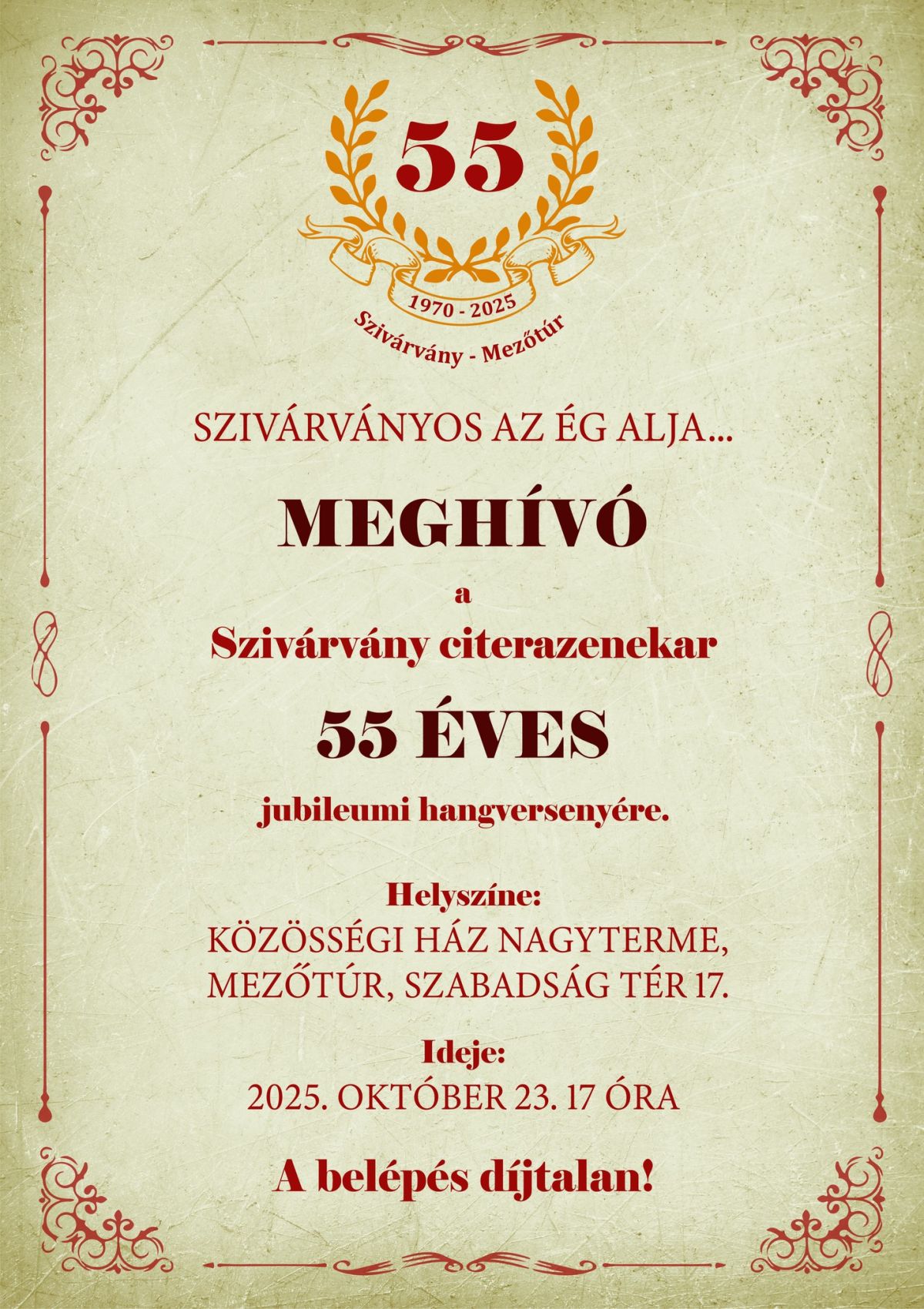Nagy szeretettel és tisztelettel meghívjuk a népzene kedvelőit a Szivárvány citerazenekar fennállásának 55. évfordulója alkalmából rendezendő ünnepi hangversenyünkre.