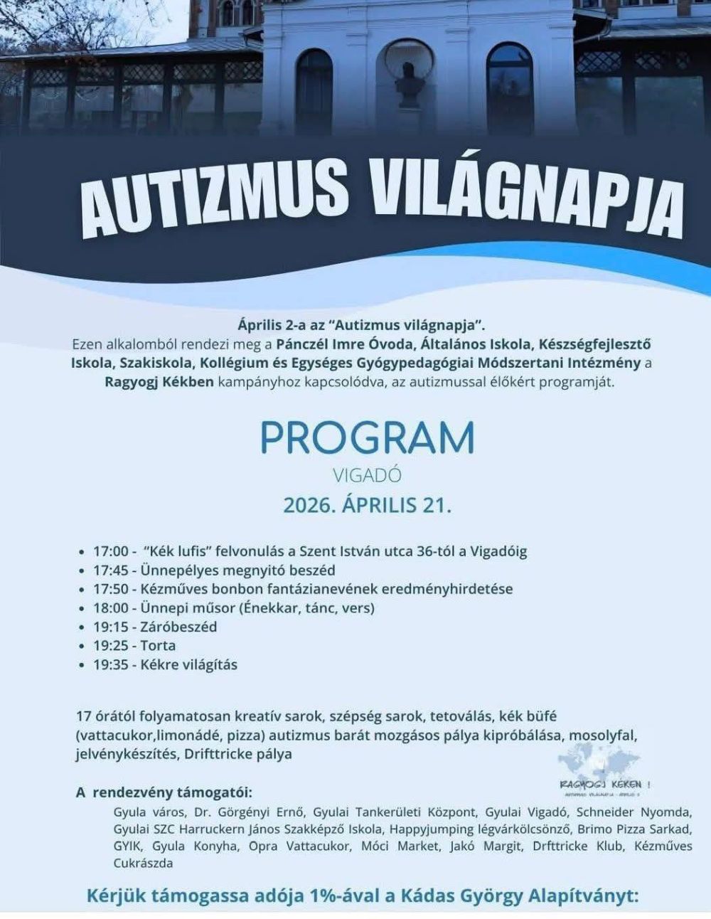 17:00 – “Kék lufis” felvonulás a Szent István utca 36-tól a Vigadóig 17:45 – Ünnepélyes megnyitó beszéd 18:00 – Ünnepi műsor (Énekkar, tánc, vers) 19:15 – Záróbeszéd 19:25 – Fény-tánc