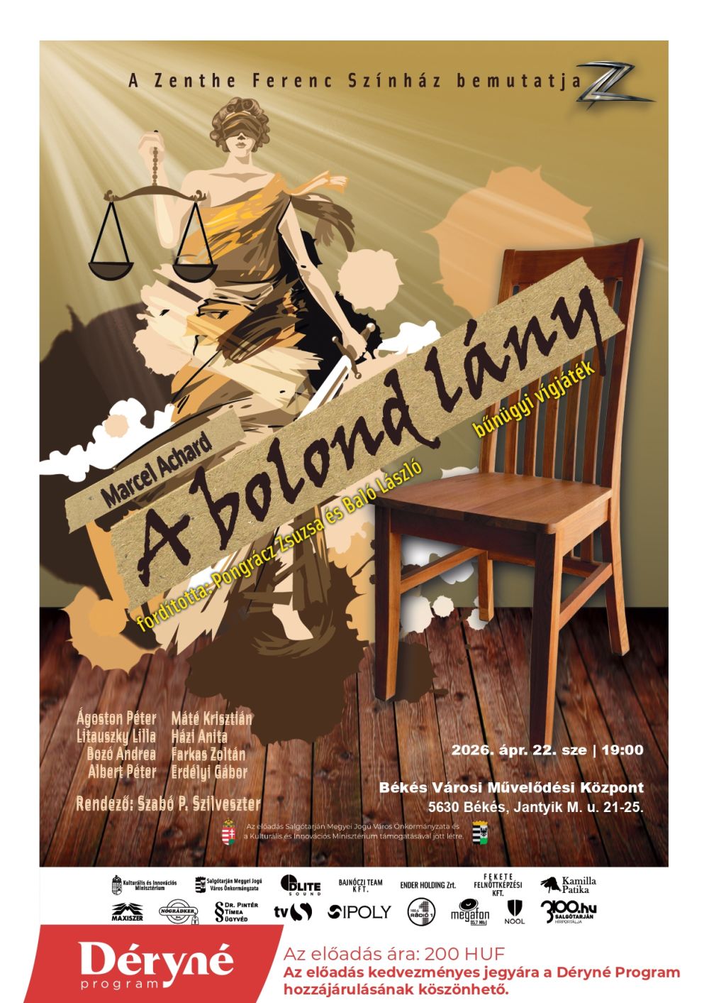 A Déryné Program támogatásával 2026. április 22. (szerda) 19:00 órától, a Békés Városi Művelődési Központban (Békés, Jantyik M. u. 21-25.) kerül bemutatásra Marcel Achard: A bolond lány című kétfelvonásos bűnügyi vígjátéka a Zenthe Ferenc Színház előadásában.